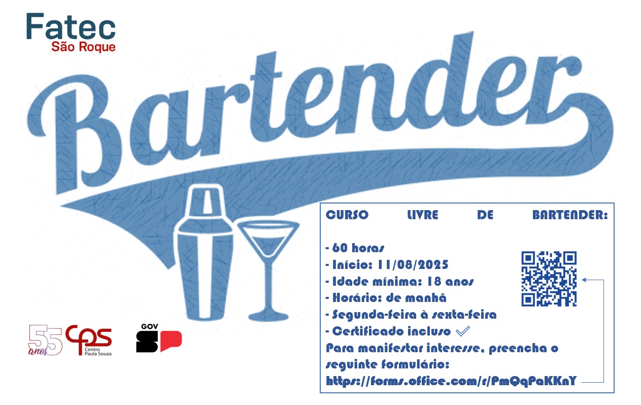 A Fatec São Roque está com inscrições abertas para o Curso Livre de Bartender, com início no dia 11 de agosto. O curso é gratuito, com duração de 60 horas e voltado para maiores de 18 anos. As aulas serão realizadas de segunda a sexta-feira, no período da manhã, e os participantes receberão certificado ao final do curso.