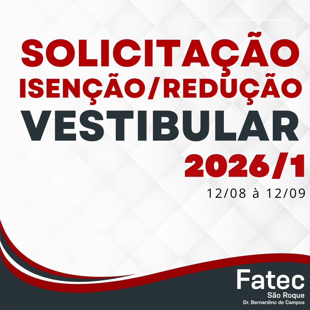 O Centro Paula Souza (CPS) disponibiliza benefícios para pagamento da taxa do Vestibular das Faculdades de Tecnologia do Estado (Fatecs) para o primeiro semestre de 2026. Os candidatos interessados poderão solicitar isenção total ou redução de 50% do valor da inscrição entre 12 de agosto e 12 de setembro, exclusivamente pelo portal vestibular.fatec.sp.gov.br.